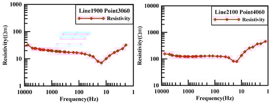 Before inversion, CSAMT data processing mainly includes the elimination of flying points and the smoothing of the Cagniard apparent resistivity and phase data at each measurement point, as well as the static correction and spatial filtering of apparent resistivity and phases along the entire survey line. Figure 11 shows the apparent resistivity frequency sounding curve obtained after data processing for some of the measurement points. From Figure 11, it can be seen that the apparent resistivity curve is smooth, continuous, and has a clear morphology. The characteristics of the far zone, transition zone, and near zone of the curve are obvious, which conform to the standards of CSAMT apparent resistivity sounding curves.