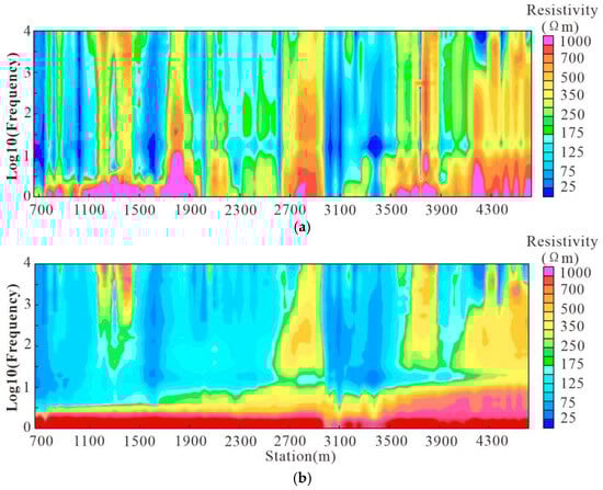 Pseudo-section diagram of CSAMT apparent resistivity for Line 2100. (a) Original pseudo-section diagram; (b) pseudo-section diagram after static correction.