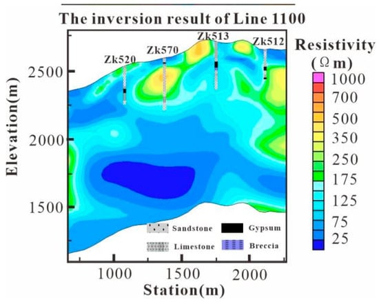To interpret the electrical structure detected using CSAMT, we used the two-dimensional inversion results of Line 1100 as a reference section. The main reason for selecting Line 1100 is that it has abundant borehole data, covering most of the stratigraphic lithologic units (including ore bodies) and major structural interfaces (including thrust nappes) in the mining area. The interpretation method we adopted involves combining the shallow subsurface electrical structure with borehole data and then conducting a comparative analysis with the inversion results.