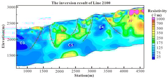 Line 2100 is the longest survey line, and it is located to the south of Line 2400. As shown in Figure 15, the electrical structure of Line 2100 is complex, as it is separated by five faults. Similar to Line 2400, Region II exhibits a high-resistivity background with alternating high and low resistivity from shallow to deep. However, the exposed area of the Yunlong Formation in Region IV on the west side is different from the western segment of Line 2400 that shows high resistivity, which reflects a relatively intact J-K stratigraphic system. The difference between Region III and Line 2400 is that although both are exposed areas of the Yunlong Formation, their electrical characteristics are completely different. The high-resistivity background indicates that the deep part of this region may have structural features similar to Region II. However, the presence of high conductor C5 corresponds to C2 in Line 2400. Similarly, high conductor C4 corresponds to C1 in Line 2400, reflecting the Guolang Formation. Additionally, high conductor C3 is present on the west side of the Fengzishan mineral segment, which requires further investigation.