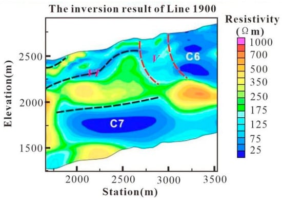 Line 1900 is located to the south of Line 2100 and also crosses the Jiayashan mineral segment. As shown in Figure 16, The profile of Line 1900 is divided into three parts by faults. The low-resistivity zone at C6 in the eastern segment, compared with C1 in Line 2400 and C4 in Line 2100, indicates the stable electrical characteristics of the Guolang Formation in the north–south direction. However, the presence of the Bijiang Fault enhances the extent of the high conductor C6. The moderate resistivity in the middle mineral segment (Region V) shows slight differences from the electrical structures of the previous two survey lines. The western segment (Region VI) can be compared with Region III of Line 2100, with the difference being that Region VI has a wider distribution, and the underlying high conductor C7 can be connected to C5 in Line 2100.