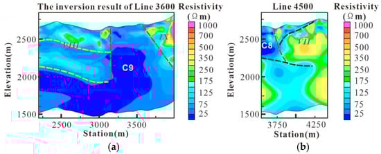 The relative positions of the survey lines on the plane are shown in Figure 8. Line 4500 and Line 3600 are located on the north side of the PaoMaping mining area; Line 2400, Line 2100, and Line 1900 pass through the Jiayashan mining area; and Line 1100 and Line 700 are located on the west side of the Nanchang mining area. The north–south span of the survey lines is approximately 3.8 km, and all survey line profiles are oriented east–west, which provides assistance for comparing the three-dimensional spatial positions of the underground electrical structures. Due to the significant differences and distinct contrasts in resistivity presented in the two-dimensional continuous medium inversion results, as well as the abundant details in the electrical structures, the interpretation of the electrical structures primarily relies on the two-dimensional inversion results.