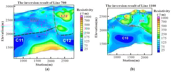 Lines 1100 and 700 are located to the south of the Jinding mining area and to the west of the Nanchang mineral segment. As shown in Figure 18, the shallow high-resistivity bodies in Line 1100 outline the distribution of the exotic thrust bodies, while the in situ stratigraphic system may be located in Regions XI and XII. Line 700 is situated to the south of Line 1100 and can be divided into eastern and western segments. The low-resistivity background in Region XIII indicates that the exotic thrust system is relatively thin, with the in situ system dominating at depth. In Region XIV, the surface exposes strata of the Yunlong Formation, and the alternating high- and low-resistivity features may indicate that the stratigraphic system has undergone a certain degree of structural deformation or experienced large-scale fluid activity. Its electrical characteristics are similar to the mineralization system observed in the previously mentioned profiles.