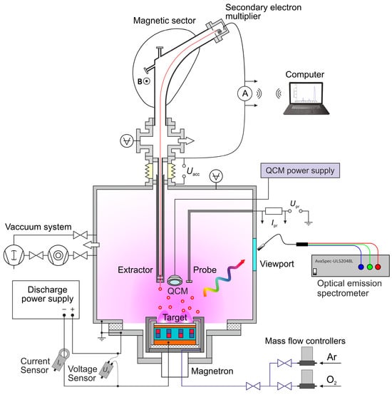 A magnetic sector mass analyzer (MA) was used to determine the mass-resolved ion fluxes in the typical substrate placement area. MA comprised an electrostatic extractor attached to the vacuum chamber pointed at the racetrack region of the magnetron. The extractor was essentially a three-electrode electrostatic lens realizing the functions of sampling ions from plasma, accelerating them and forming an ion beam. The entrance plasma-facing electrode was grounded, while the accelerating electrode, the magnetic sector, and all related equipment were under high voltage (Uacc) relative to the ground potential. In order to improve the sensitivity of the instrument, a secondary electron multiplier (SEM) was used as a detector of mass-filtered ions. The further details of the mass spectrometer configuration are discussed in [44,62]. The acquisition time for each ion mass spectrum was 1 min.