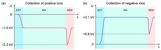In order to have an ability to measure the mass-resolved fluxes of both positive and negative ions, the detection system was arranged in two different configurations depending on the charge sign. The corresponding diagrams of electric potential distribution inside the MA are shown in Figure 2.
