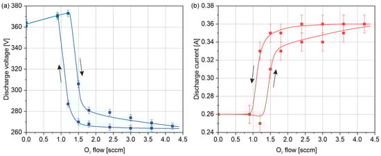 Magnetron discharge parameters at different O2 flow rates: (a) voltage; (b) current. The arrows mark the forward and reverse curves.