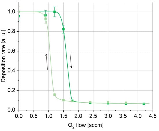 The hysteresis loop observed in the deposition rate curve exhibits the same starting point and width as in the voltage and current curves (Figure 3). However, unlike in those, no deviations between forward and reverse trends are present here. This might suggest the differences in charged particle (ions and electrons) fractions’ dependence on the direction of oxygen flow rate change, which can be pronounced in the voltage and current measurements. Equality of the forward and reverse QCM signals at oxygen flow rates exceeding 1.8 sccm means the same total mass deposition rate, i.e., the same flux of heavy species arriving at the substrate for both scenarios.