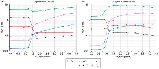 The intensities of the ion fluxes have been plotted in log scale for a clearer understanding of the dependences. Figure 5a shows the dependences plotted with increasing reactive gas flow in the forward direction while Figure 5b demonstrates the dependences plotted with decreasing reactive gas flow in the reverse direction. Two limiting cases can be visualized here: before transition (left side of threshold, 0.9–1.2 sccm oxygen flow) and after transition (right side of threshold, 1.8 sccm oxygen flow). The left part of the graph is indicative of low fractions of oxygen, which is due to the chemisorption of supplied oxygen on the surface of the target. The oxygen molecules are trapped in the surface, forming an oxide layer on the target, hence poisoning it [51]. The remaining ion contribution parameters are generally constant and stable.