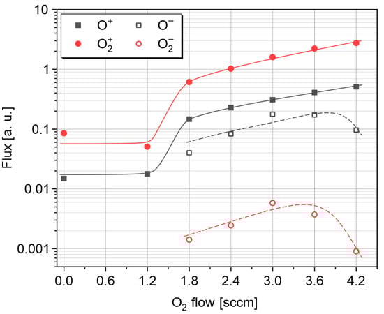 It was found that negative atomic oxygen ions have a sharp positive correlation, and negative molecular oxygen ions have a sharp negative correlation with an increase in the flow rate of reactive oxygen gas (Figure 6). Here, too, it was observed that the negative oxygen ions had a nonlinear dependence after a threshold of 1.2 sccm of oxygen flow.
