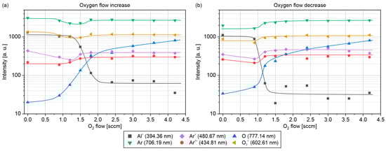 Optical emission intensities of plasma constituents vs. oxygen flow rate: (a) flow rate increasing; (b) flow rate decreasing.
