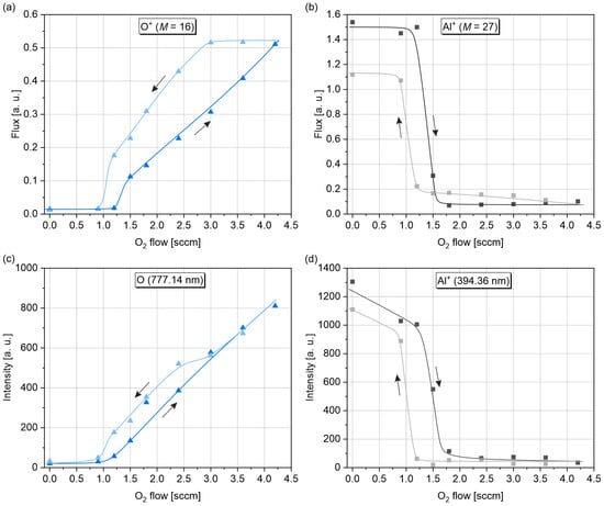 Comparison of hysteresis curves in ion mass spectrometric (a,b) and optical emission spectroscopic (c,d) measurements: (a) ion flux signal of O+ ions; (b) ion flux signal of Al+ ions; (c) emission intensity of O line (λ = 777.14 nm); (d) emission intensity of Al+ line (λ = 394.36 nm).