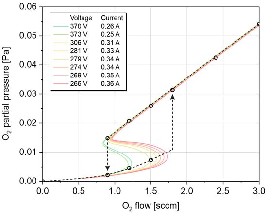 In the power regulation mode, both the voltage and current change when the reactive gas flow is varied. In Figure 8, several pressure–flow lines were built according to Berg model solutions corresponding to different voltages, at a constant power of 100 W. They were calculated for a fixed pair of experimentally observed voltage and current values (indicated in the legend). The circles correspond to the potential operation modes available for the given oxygen flow. To reconstruct the real oxygen pressure–flow curve, one should therefore combine the experimental evidence for the metallic-to-oxide transition (Figure 3, Figure 4 and Figure 8) and the calculated hysteresis curves (Figure 9).