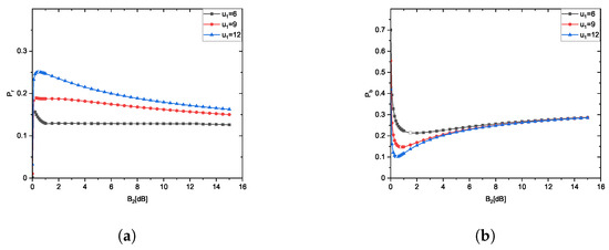 Figure 6a,b shows and as a function of for different user density and MEC server density ratio /, respectively. Equation (2) indicates that directly correlates with the arrival rate. High overloads the first-tier MEC servers and the second-tier MEC servers. It can be seen from Figure 6a,b that when / is the same, the Probability of Immediate Service is relatively high when is low, and the Blocking Probability is, otherwise, due to the decrease in total user tasks. When the density of first-tier MEC servers / increases, becomes larger and becomes smaller as the number of the first-tier MEC server increases.