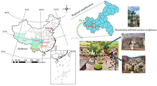 The climate in Southwest China (Figure 1) is characterized by year-round high temperatures, high humidity, and abundant rainfall, rendering it one of the regions most severely impacted by acid rain in the country. Sandstone, a natural material, is widely used in constructing rock-cut caves and stone carvings due to its fine-grained and soft texture, enabling intricate carving. However, prolonged exposure of sandstone to dynamic acid rain cycles and static immersion in residual rainwater has caused severe damage to the surface layers of sandstone-based rock-cut caves and stone carvings in this region. Understanding the mechanisms underlying this deterioration is crucial for developing effective preservation strategies to protect these invaluable cultural heritage sites.
