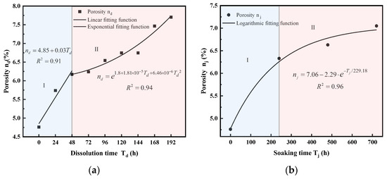 As shown in the figure, sandstone porosity progressively increases with dissolution time under both dynamic cyclic dissolution and static immersion conditions. For dynamic cyclic dissolution, porosity shows a strong linear relationship with dissolution time during Stage I (for example, 0–48 h as shown in Figure 7a), followed by an exponential relationship in Stage II (for example, 48~192 h as shown in Figure 7a). In contrast, static immersion dissolution leads to an exponential increase in porosity over time. During Stage I (for example, 0~240 h as shown in Figure 7b) of static immersion, porosity rapidly increases to 1.33 times the initial value, while, in Stage II (for example, 240~720 h as shown in Figure 7b), the rate of porosity increase slows, reaching 1.48 times the initial value after 720 h of dissolution. These trends highlight the distinct mechanisms of porosity evolution under dynamic and static dissolution: dynamic dissolution accelerates porosity growth through enhanced pore connectivity whereas static immersion results in a more gradual increase, primarily driven by the enlargement of existing pores. These findings offer critical insights into the time-dependent degradation of sandstone under different environmental conditions, providing a scientific basis for preserving sandstone-based cultural heritage.