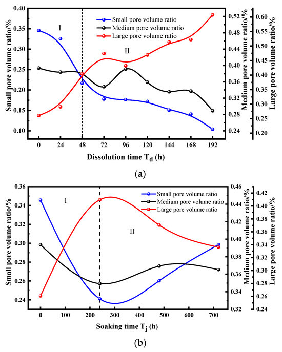 Variation in small, medium, and large pore proportions under different dissolution conditions. (a) Dynamic cyclic dissolution, (b) dynamic cyclic dissolution.