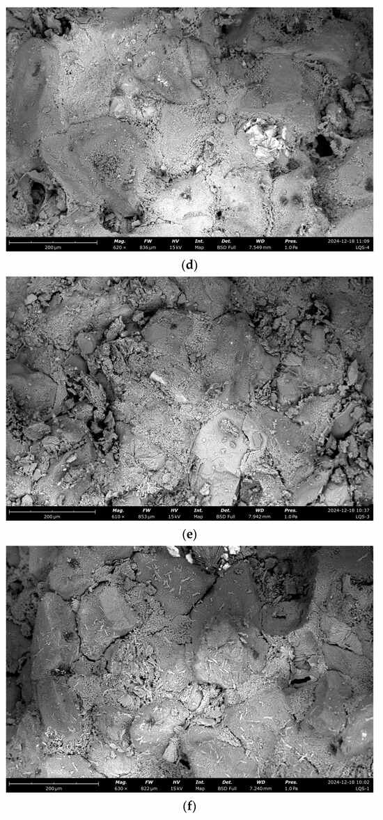 To investigate microscopic changes in the pore structure, scanning electron microscopy (SEM) was used to analyze the surface morphology of sandstone samples subjected to dynamic and static dissolution, e.g., the SEM images in Figure 9.