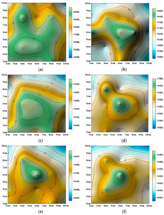 As shown in Figure 10, overall surface hardness progressively decreases, with hardness values significantly lower than those of untreated samples. The lowest hardness values consistently appear in the upper-right corner while the highest values are located in the central region. Hardness decreases radially from the center toward the edges. Initially, hardness values in the inner and outer regions are similar, but, as cyclic dissolution continues, contour lines become more localized, the central high-hardness area shrinks, and overall surface hardness heterogeneity increases.