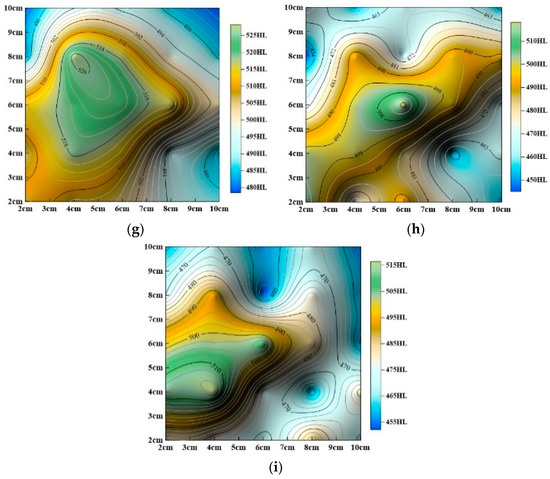 Evolution of surface hardness contour maps with dynamic cyclic time (a) Undissolved, (b) dynamic dissolution for 24 h, (c) dynamic dissolution for 48 h, (d) dynamic dissolution for 72 h, (e) dynamic dissolution for 96 h, (f) dynamic dissolution for 120 h, (g) dynamic dissolution for 144 h, (h) dynamic dissolution for 168 h, (i) dynamic dissolution for 192 h.