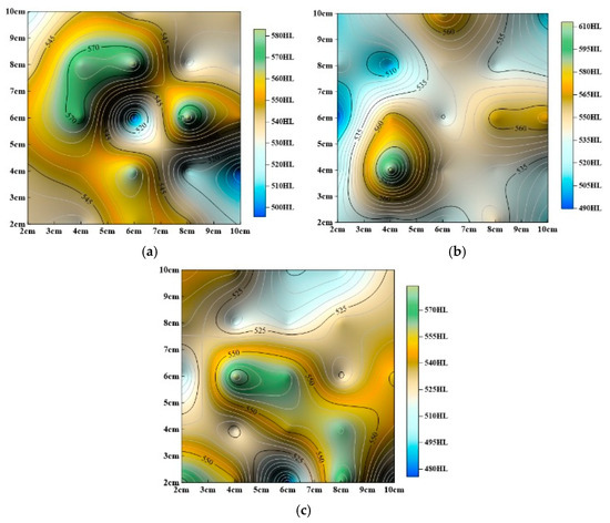 Evolution of surface hardness contour maps with static immersion time. (a) Static dissolution for 240 h, (b) static dissolution for 480 h, (c) static dissolution for 720 h.