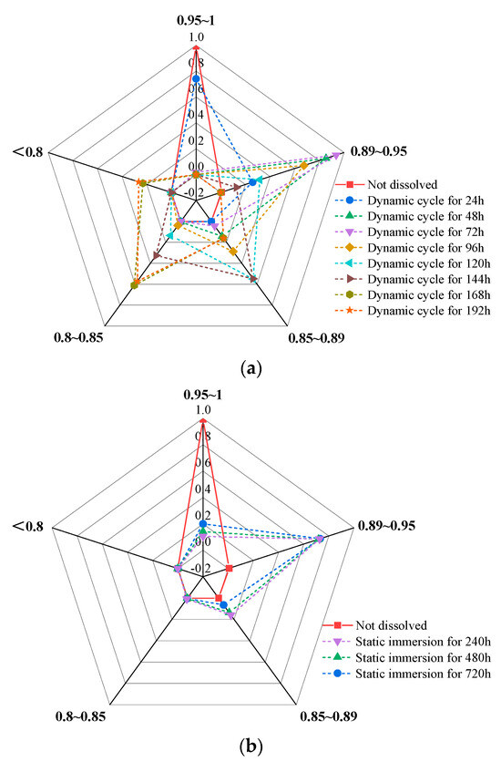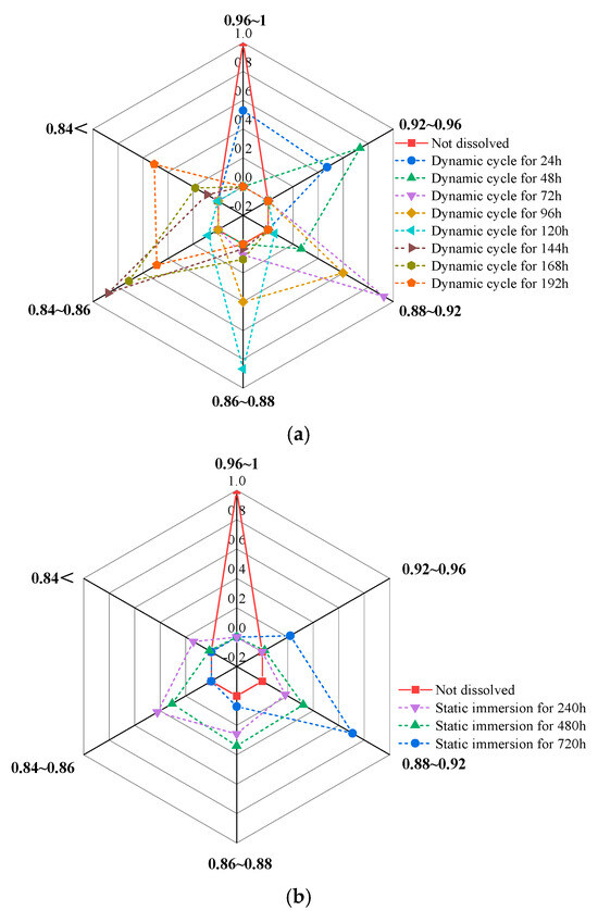 In the radar chart (Figure 12a), a finer distribution indicates a more concentrated pattern. As cyclic dissolution time increases, the hardness ratio decreases, and the distribution range gradually expands, reflecting an enlargement of the affected area. Critical turning points occur at 72 h, 120 h, and 168 h of cyclic dissolution, where hardness ratios exhibit relatively concentrated distributions. At 72 h, hardness ratios primarily range from 0.89 to 0.95. By 120 h, the main distribution shifts to 0.85–0.9. At 168 h, hardness ratios are no longer concentrated in a single range but are nearly evenly distributed between 0.8–0.85 and below 0.8. Combined with contour map analysis, the upper-right corner of the rock slab is identified as the region with the lowest dynamic dissolution intensity and the most vulnerable to potential damage.