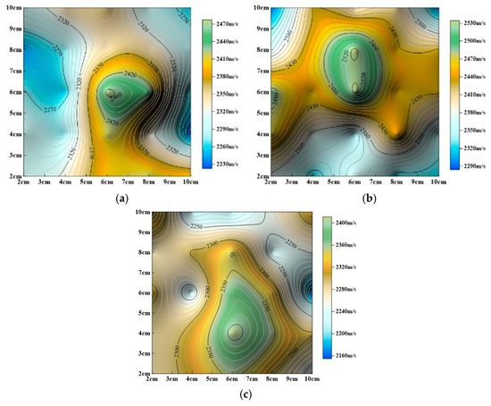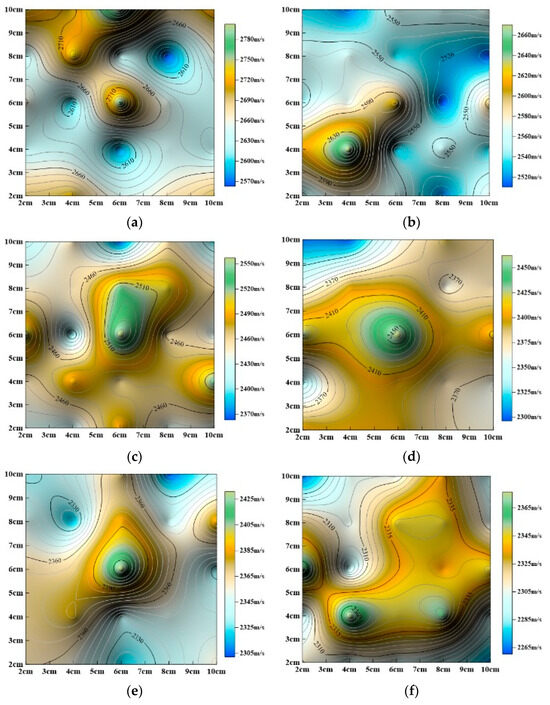 P-wave velocity is a reliable indicator of pore and micro-fissure development within the rock, as well as the degree of specimen damage [22]. To compare changes in surface acoustic wave distribution under different dissolution conditions, acoustic wave contour maps for dynamic and static dissolution are presented in Figure 13 and Figure 14.