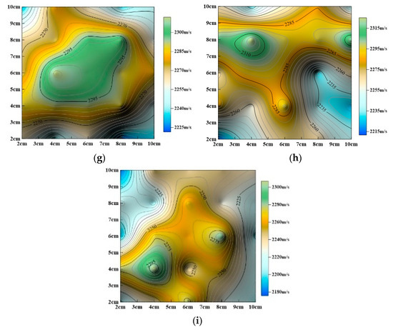 Evolution of P–wave velocity contour maps with dynamic cyclic time. (a) Undissolved, (b) dynamic dissolution for 24 h, (c) dynamic dissolution for 48 h, (d) dynamic dissolution for 72 h, (e) dynamic dissolution for 96 h, (f) dynamic dissolution for 120 h, (g) dynamic dissolution for 144 h, (h) dynamic dissolution for 168 h, (i) dynamic dissolution for 192 h.