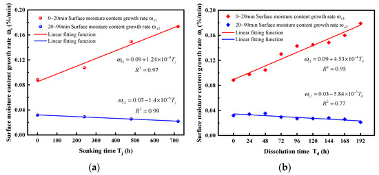 As shown in Figure 17, the two phases of moisture content growth rate under static and dynamic dissolution exhibit a strong linear relationship with dissolution duration.