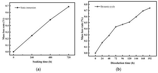 Figure 18 reveals that mass loss rates rise progressively over time in both dynamic and static dissolution processes. Dynamic cyclic dissolution shows phased increases in mass loss, with growth rates decreasing and a notable inflection point at 72 h. After 192 h of dynamic cycling, the mass loss rate reaches 0.74%. Static immersion dissolution exhibits a nearly linear mass loss trend, reaching 0.7% after 480 h. After 480 h of immersion, the rate of mass loss increase exhibits a slight deceleration.