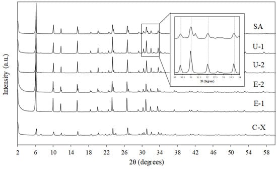 The XRD analysis of E-1, E-2, U-1, U-2, SA, and C-X zeolite adsorbents is shown in Figure 2. For all the samples, a FAU crystalline framework was observed. More precisely, zeolites were crystallized in a cubic structure (space group: Fd) with a refined lattice parameter of 25.0720 (3) Å for sample E-1, 25.0339 (4) Å for sample E-2, 24.9910 (3) Å for sample U-1, 24.9888 (3) Å for sample U-2, 24.9864 (8) Å for sample SA, and 25.0043 (4) Å for sample C-X. An additional faujasite X phase was found in samples E-2 and SA, matched to the literature as having the chemical formula [28]. On the other hand, an additional Linde-Type A (LTA) phase was detected in samples U-1, U-2, and C-X (space group Fmc). It is worth noting that the XRD pattern of the SA sample showed a shift in the characteristic peaks of X zeolite (see insert in Figure 2), possibly resulting from differences in the Na+ and Li+ content, resulting in the contraction of the unit cell [29].