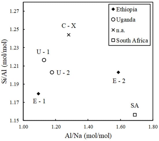 The values of Si/Al and Al/Na (mol/mol) determined by WDXRF for each sample highlighting their region of provenance.