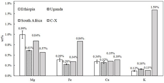 Metal cations such as Mg, Ca, K, and Fe were found in the samples by WDXRF, as reported in Figure 4 (note that Li cannot be detected by this technique). Here, the results are presented by grouping the samples according to the geographical region of provenance. This was performed to highlight the potential occurrence of impurities on the surface of the materials and to correlate them with the environmental conditions of the country in which they were employed. No significant variation in the wt% of the above-mentioned elements was observed between the samples, with the exception of the K amount in the C-X one. In this case, the higher presence of K is linked to the zeolite framework probably due to an incomplete ion exchange procedure adopted during the conversion from KX to LSX zeolite [35]. Since this sample was not employed as an adsorbent in African medical environmental settings, the presence of some kind of contaminant accumulated on its surface is obviously to be excluded. As explained in Section 2.2, particular attention was given to the eventual detection of Zr, Ti, and Mn, whose occurrence in African dust elevates them as key indicators of dust on the zeolite samples. The WDXRF analysis revealed the presence of only a very small amount of Zr, Ti, and Mn (approximately 30–300 ppm) in all the samples, including the C-X zeolite. Thus, the outcome did not evidence the presence of dust. It should be noted that Fe is present even in the sample of C-X, so this cannot be due to the presence of dust and must be a contaminant in all the samples. The presence of Fe, as well as K and Ca, in 13X zeolite was also reported in the literature by other works [36,37].