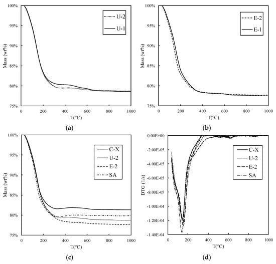 Plots of the results of the thermo-gravimetric analysis (TGA). Comparison between sample U-1 and U-2 (a) and sample E-1 and E-2 (b). Additional comparisons for samples C-X, U-2, E-2, and SA for the mass variation (c) and derivative of the mass variation (d).