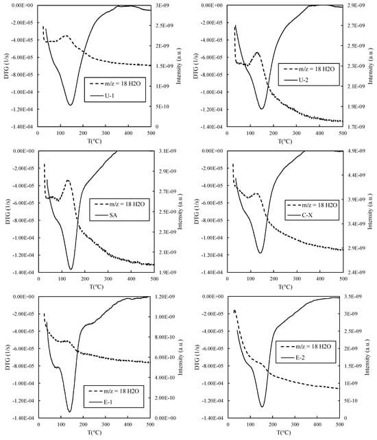 Plot of the first-order derivative of the mass variation over the duration of the TGA test (DTG) against MS curves, with the characteristic water mass–charge ratio (m/z) of 18.