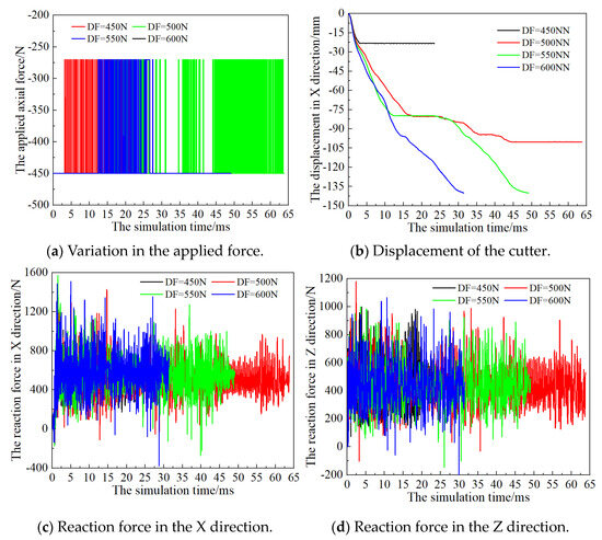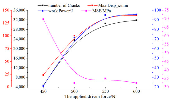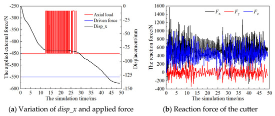 - The influential factors of load factor, initial axial force, and driven force on the kinematics and rock fragmentation behavior are clarified based on the proposed method. The use of the proposed method of this kind of tool can systematically decrease the reaction force in the cutting direction, while axial reaction force exhibits non-uniform fluctuations. The total crack count inversely correlates with MSE, and the tensile cracks account for 85% of total failures, consistent with the simulated rock’s tensile-dominated failure mode. The cracks generated a decrease while increasing the load factor, which increases linearly with the driven force and follows a parabolic trend with the initial axial force acting on the PDC cutter.