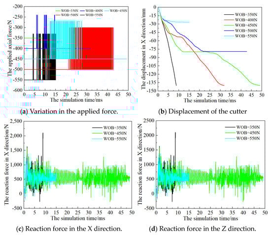 - A kind of simulation model of rock breaking under the action of a PDC cutter based on the discrete element method (DEM) is established, incorporating the proposed adaptive matching method of drilling load to dynamically adjust applied axial force according to the reaction force monitored in the cutter. This simulation framework enables systematic investigation of the rock-breaking mechanism under adaptive load conditions.