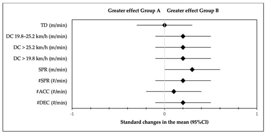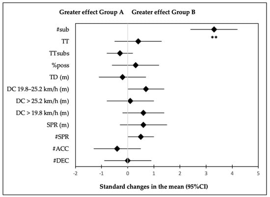 | Relative Running Activity | 2nd Half Group A (2.8 Substitutions) | 2nd Half Group B (4.4 Substitutions) | ES (95%CI) | p Value |