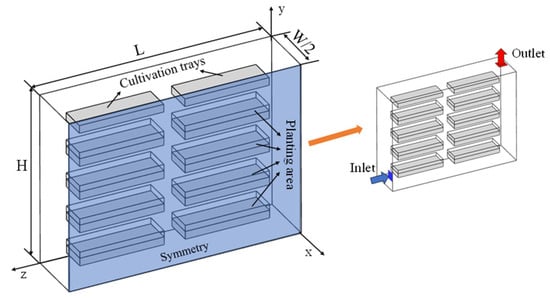 In this study, three-dimensional modeling of airflow and fluid heat transfer within a plant factory has been performed. The dimensions of the plant factory in the three-dimensional model are 4.4 m in length, 2.2 m in width, and 3.3 m in height. Four cultivation shelves with four layers of trays (tray number 1, 2, 3, and 4) are located inside the plant factory. The dimensions of the cultivation tray are 1.6 m in length, 0.5 m in width, and 0.15 m in height. The area of 0.12 m above the cultivation tray [] is the crop planting area, which is of the same length and width as that of the cultivation tray and 0.12 m in height. The dimensions of the plant factory, the cultivation tray, as well as crop planting areas, are shown in Table 2. In this research, it is assumed that both sides of the cultivation shelf are symmetrical, and one-half of the room is chosen as the target area for the study. The computational domain model of the research objective is shown in Figure 1.
