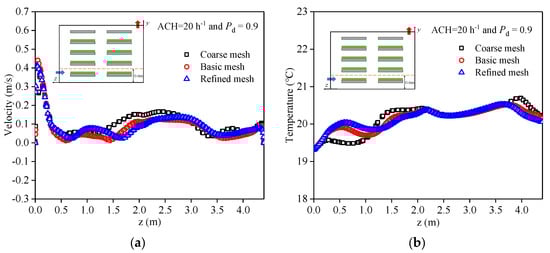 In the study, the hexahedral type of mesh is applied to discretize the entire computational domain. Finer mesh sizes are used near LED light walls, crop area surfaces, and airflow inlet and outlet surfaces. To ensure that the numerical results are not affected by the size and number of mesh, the results are simulated for three cases where the number of mesh is 552,789 (Coarse mesh), 1,984,032 (Basic mesh), and 2,847,910 (Refined mesh). The variation in air velocity and temperature along the z-axis direction for y = 0.6 m and x = 0.55 m in the numerical model is compared in Figure 3. As shown in Figure 3, the difference between the velocity and temperature predictions of the refined and basic meshes is minimal. Therefore, in order to achieve an optimum between the accuracy of the simulation results and computational efficiency, the model mesh is chosen as the basic mesh in the following numerical simulation study.