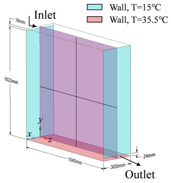 In this study, the experimental data from Blay et al. on non-isothermal mixed convection in a square-type ventilated box were employed for model validation []. An experiment was conducted in a cavity with dimensions of 1040 × 1040 × 700 mm3 (D × H × W), where an air inlet with a height of 18 mm was set on the wall on the width side and an outlet with a height of 24 mm was set at the bottom of the wall opposite to the inlet. The entire cavity was divided into three smaller cavities, including the measuring cavity in the center and the protective cavities on both sides, which are separated by transparent double glazing. The cavities on both sides were used to eliminate the influence of the surrounding thermal environment on the flow in the center measurement cavity. Moreover, the surrounding walls were maintained at a constant uniform wall temperature (15 °C) using a temperature-controlled water system, while the bottom wall was heated to 35.5 °C and maintained at a constant level. The inlet air temperature was controlled at 15 °C in the experiment, the inlet velocity was set to 0.57 m/s, and the turbulence intensity at the inlet was 6%. Time-averaged velocity and temperature measurements were performed when the experimental conditions reached a statistical steady state. The measurements from this experiment provide validation support for numerical calculations of the non-isothermal mixed flow and heat transfer of indoor air [,].