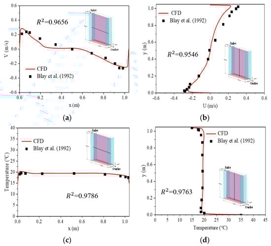 Comparison of CFD results with the experimental data from literature []: (a) horizontal velocity component at y/L = 0.5; (b) vertical velocity component at x/L = 0.5; (c) temperature at y/L = 0.5; (d) temperature at x/L = 0.5.