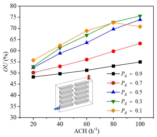 Furthermore, it can be observed that the air velocity above the crop in the cultivation tray near the outlet side is higher compared to the cultivation tray on the inlet side. This discrepancy is attributed to the heat generated by the LED lamps, which results in a higher air temperature at the outlet compared to the air temperature at the inlet. As a result of the thermal buoyancy force induced by the heat dissipation of the LED lamps in the room, the air with the higher temperature near the exit side tends to flow upwards. Therefore, based on the variation in OU with ACH depicted in Figure 6, it can be concluded that increasing ACH or decreasing Pd generally results in higher OU values. However, it should be noted that the combination of higher ACH and lower Pd does not necessarily imply greater OU values, as observed in the case of Pd = 0.1 and ACH = 100 h−1. This occurs because, when the ACH is too high, the excessive air velocity at the inlet of the indoor ventilation system causes the air velocity above the cultivated tray crop near the inlet side to become too high. As a result, the air velocity deviates significantly from the optimum velocity (U0), leading to a decrease in the overall OU value of the room. Hence, in situations where the planting density of the indoor cultivation tray crop area is high, increasing the ACH value can enhance the overall uniformity of the airflow rate above the indoor crop area. Conversely, when the planting density of the indoor cultivation tray crop area is low, a smaller ACH value can be utilized, potentially reducing energy consumption related to the ventilation system while still ensuring improved airflow uniformity over the crop area.