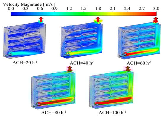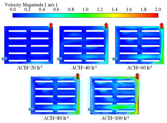 The uniformity of air temperature distribution above the crops plays a crucial role in promoting optimal crop growth. Figure 12 illustrates the variation in the overall RSDT of the air temperature above the crops at all five planting densities at different ACH. It can be observed that the highest RSDT values occur at ACH = 20 h−1 for all planting densities. This is because, in cases with lower ACH where the indoor air is primarily influenced by thermal buoyancy, there is a tendency for temperature stratification along the height. As the ACH increases, the RSDT decreases for all planting density cases. This is because the inlet of low-temperature air increases, leading to a stronger mixing flow indoors (Figure 13). Consequently, the influence of thermal buoyancy on the indoor airflow gradually diminishes, resulting in a more uniform air temperature distribution above the crop. Moreover, as the ACH increased (in cases where ACH < 60 h−1), the RSDT decreased significantly in all cases with Pd, though it showed a weaker decrease in cases where ACH > 60 h−1. Meanwhile, the disparity between the RSDT of each Pd decreased with increasing ACH. This can be attributed to the fact that, when the ACH exceeded 60 h−1, although there is a gradual improvement in the mixed airflow within the room, it did not have a significant impact on reducing the temperature differences above the crops in each layer of the cultivation trays. Consequently, the changes in RSDT at each Pd became insignificant. From the temperature distribution analysis in the room with different Pd and ACH, it can be observed that increasing ACH and decreasing Pd appropriately can enhance the uniformity of temperature distribution. However, it is noteworthy that further increasing ACH (in the case of ACH > 60 h−1) and decreasing Pd does not result in a significant decrease in the RSDT. Additionally, it is important to note that significant thermal stratification occurs at lower ACH values, leading to higher RSDT values. On the other hand, increasing the ACH results in higher energy consumption by the ventilation system.
