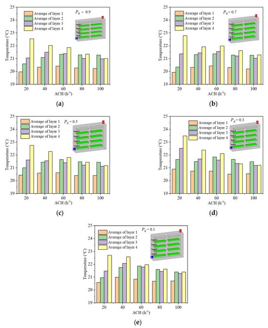 The average temperature above the crop in each layer of the cultivation tray at various Pd as a function of ACH: (a) Pd = 0.9; (b) Pd = 0.7; (c) Pd = 0.5; (d) Pd = 0.3; (e) Pd = 0.1.