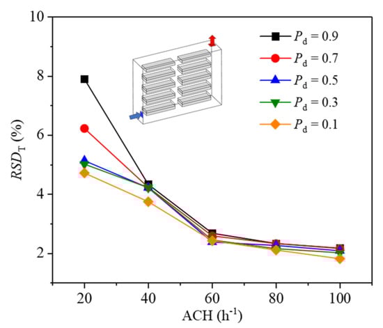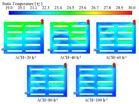 Air temperature is vital for the process of plant photosynthesis and is a crucial parameter that needs to be controlled and monitored in a plant factory. The temperature of the airflow above the crop has a direct impact on the relative humidity (RH) of the airflow and consequently affects the growth and development of the plants []. In subsequent analyses, the air temperature distribution above the crops in different crop areas will be investigated on the basis of Pd and ACH. In addition, the uniformity of temperature distribution will be assessed by analyzing the relative standard deviation of temperature.