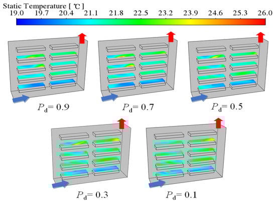 To further analyze the distribution of air temperature above all crop areas at various planting density, the two-dimensional temperature distribution above the crop in five different Pd is presented in Figure 11. These distributions are obtained under a constant ACH of 60 h−1. It can be observed that the air temperature above the lower cultivation tray is lower than the air temperature above the upper cultivation tray. Additionally, the air temperature above the crop in the upper cultivation tray is greater in the case of lower Pd than in the case of higher Pd. As depicted in Figure 8, the air velocity above the crops in the upper cultivation tray is higher when the Pd of the crop area is lower compared to when it is higher. This can be attributed to the lower resistance to flow within the room at lower Pd, which facilitates a stronger mixing flow within the heated air.