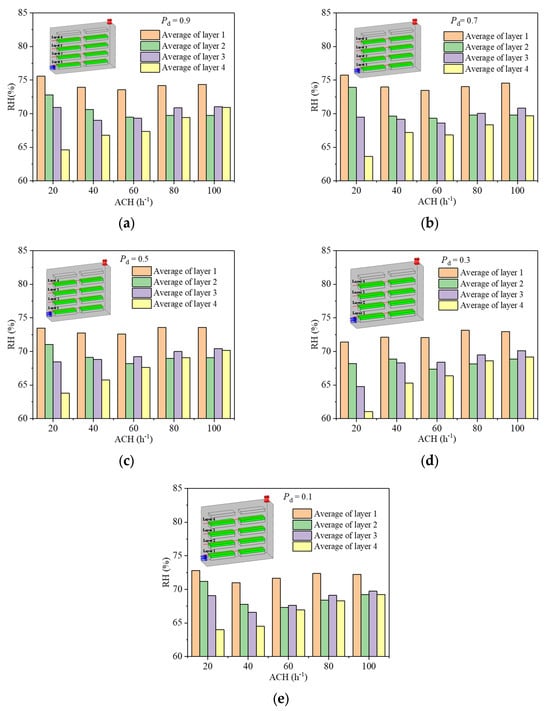 The average relative humidity (RH) above the crop in each layer of the cultivation tray at various Pd as a function of ACH: (a) Pd = 0.9; (b) Pd = 0.7; (c) Pd = 0.5; (d) Pd = 0.3; (e) Pd = 0.1.
