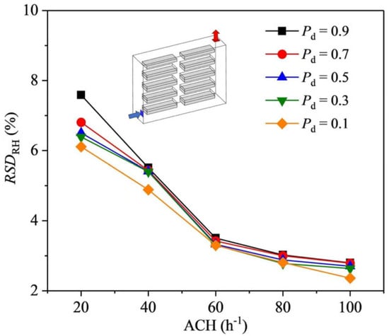 Figure 14 and Figure 15 depict average relative humidity (RH) and relative standard deviation of relative humidity (RSDRH) values above the crop in each layer of cultivation trays at different air change rate (ACH) for the five Pd as concerned. From Figure 14, it can be observed that, in the cases with Pd > 0.5 and ACH ≤ 60 h−1, relative humidity of the air above the crop area of each layer of cultivation trays decreases with the increase in the height of cultivation trays, while in the cases with ACH > 60 h−1, it appears that average relative humidity of the air above the crop area of the third layer cultivation trays is greater than that of the secondary layer cultivation trays. In the instances where simultaneously satisfying Pd ≤ 0.5 and ACH ≤ 40 h−1, relative humidity above the crop area in each layer of cultivation trays decreases as the height of the cultivation trays promotes. However, in the case of ACH = 60 h-1, volume-averaged relative humidity above the crop area in the third layer cultivation trays is higher than that in the secondary layer cultivation trays. In cases where Pd > 0.5 and ACH > 60 h−1, average relative humidity above the crop area in the third layer cultivation tray was higher than that in the secondary layer one. Figure 15 shows the overall RSDRH above the crop at five planting density at different ACH scenarios. It can be found that RSDRH decays for all Pd cases as ACH increases. Overall, relative humidity (RH) levels above the crops in each layer of the cultivation tray are generally falling within the appropriate range (air relative humidity between 50% and 70%) for all five Pd and different ACH. However, it is worth noting that the air above the crop area of the first layer cultivation tray tends to promote RH levels.