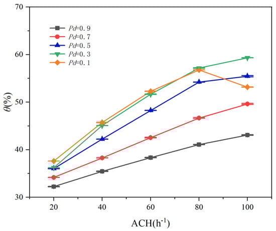 Figure 9 depicts the average temperature above the crop in each layer of the cultivation tray at various planting density (Pd) as a function of ACH. From Figure 9, the following observations can be made: (1) in the cases with crop area Pd > 0.5 and ACH ≤ 60 h−1, the average air temperature above the crops in the upper cultivation tray (layer 3 and 4 of the cultivation tray) is consistently higher than that in the lower cultivation tray (layer 1 and 2 of the cultivation tray). In the case of ACH > 60 h−1, there is a phenomenon where the air temperature above the crop area in layer 2 of the cultivation trays is higher than that in layer 3. (2) In the case of crop area Pd ≤ 0.5, higher air temperatures above the crop area in layer 2 of the cultivation tray than in layer 3 already occur in the case of ACH = 60 h−1. (3) As the ACH increased, the air temperature above the crops in each layer decreased. Specifically, in the case of a crop area with Pd = 0.1, the air temperatures above the crops in layers 1, 2, and 3 of the cultivation trays demonstrated a clear tendency to increase and then decrease.