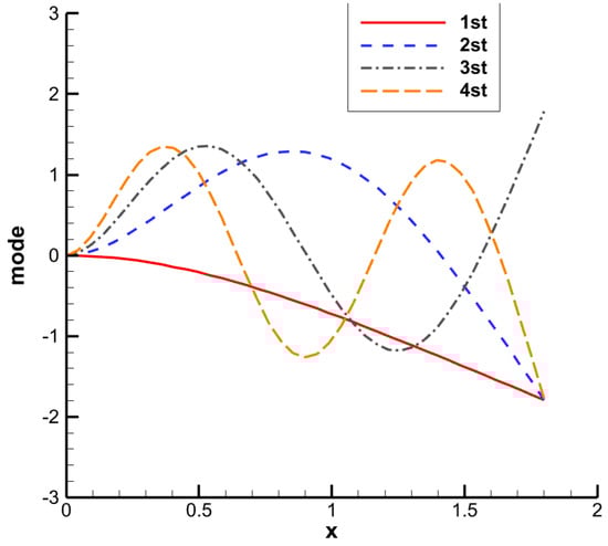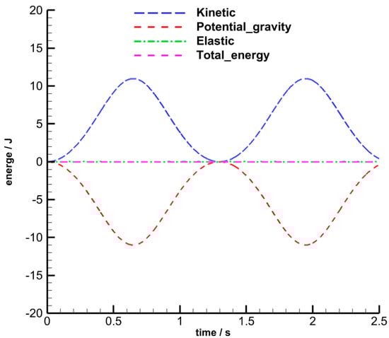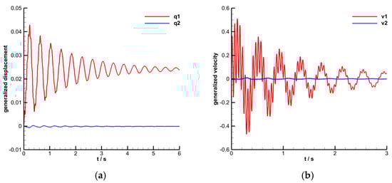 Figure 21 presents the changes in the generalized displacement and generalized velocity of the first two orders of the elastic model with time, and it can be seen that the form of the model deformation is mainly determined by first-order bending deformation; the deformation is a positive bending, which proves the phenomenon that the pitch angle is larger in the equilibrium state of the elastic model.